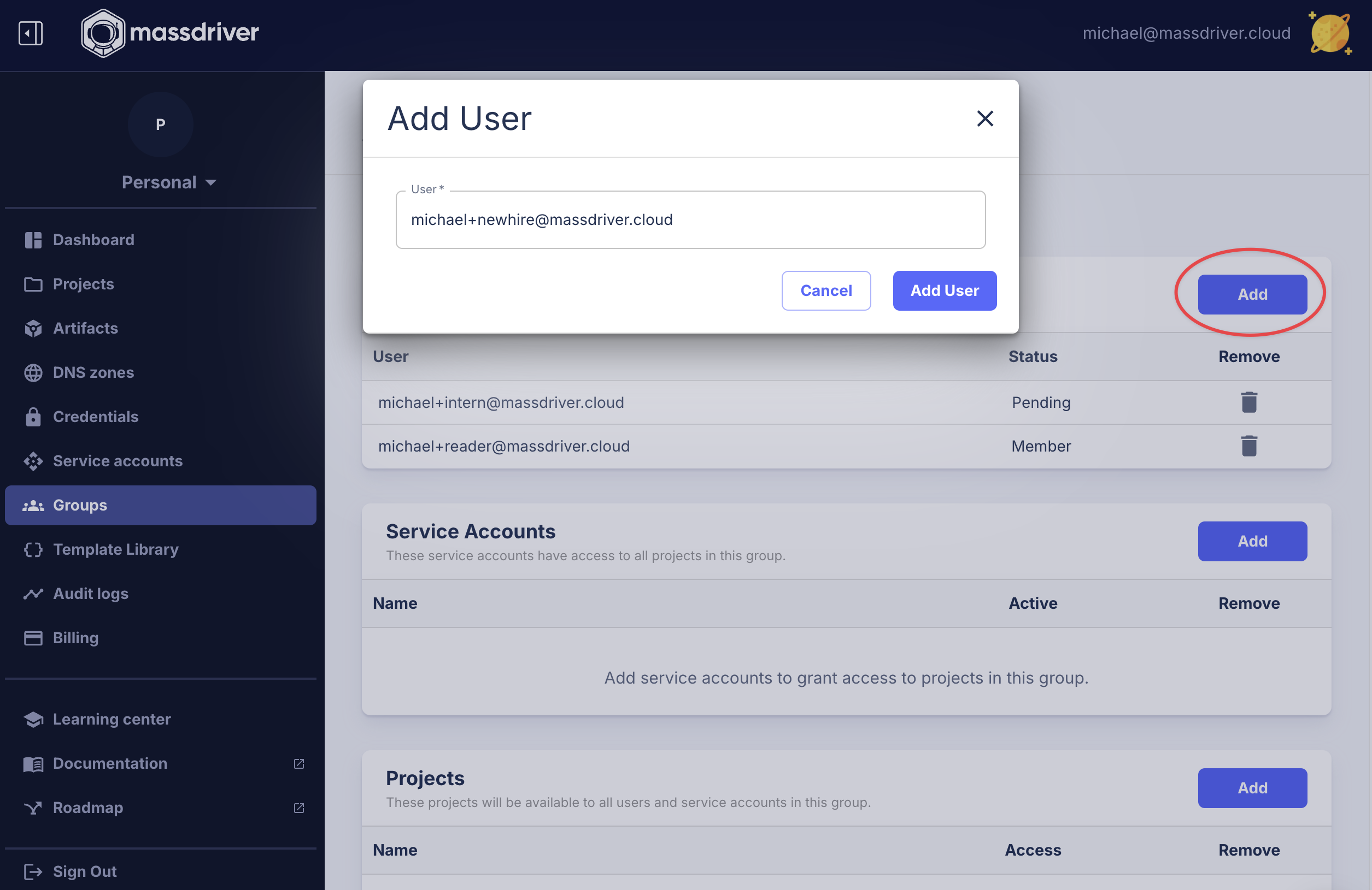 3. Click Add, enter the email of the user you wish to invite and click Add User.